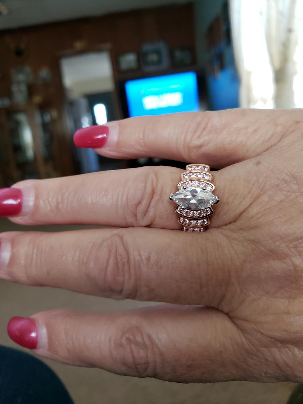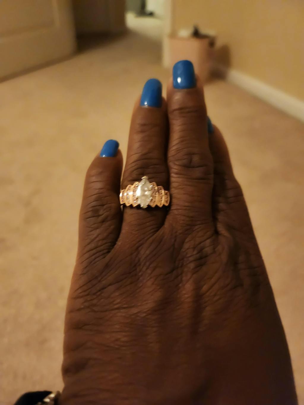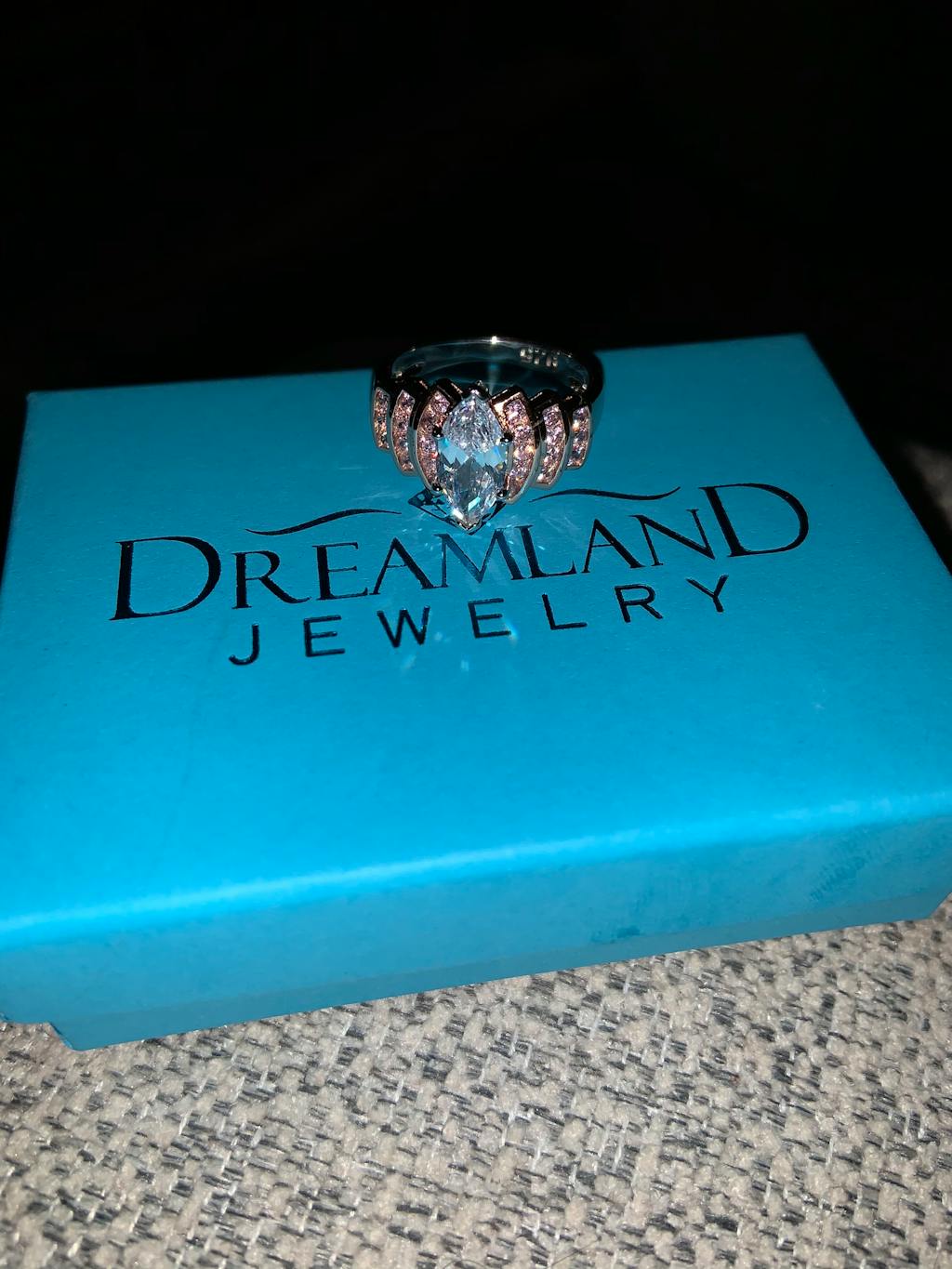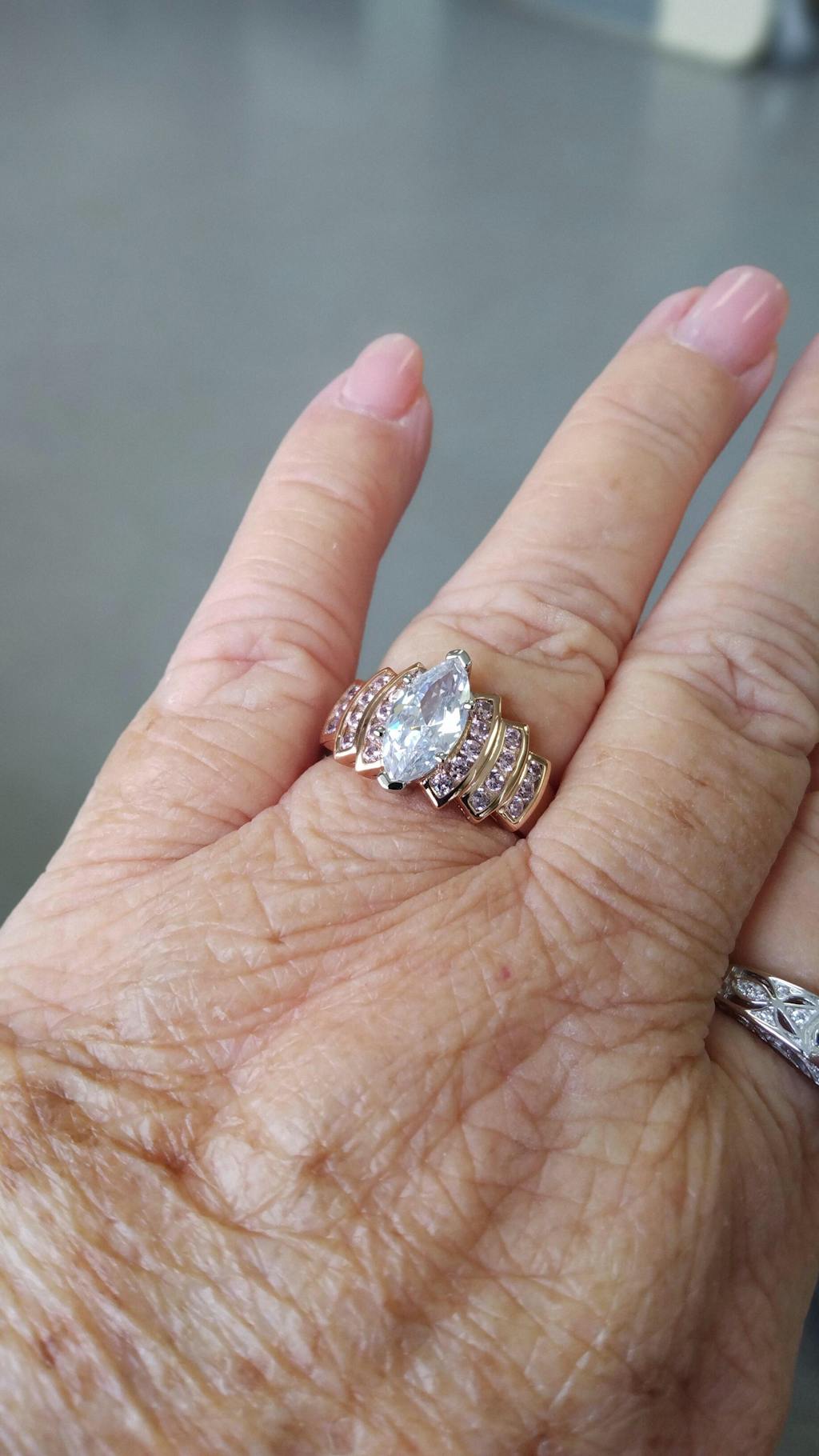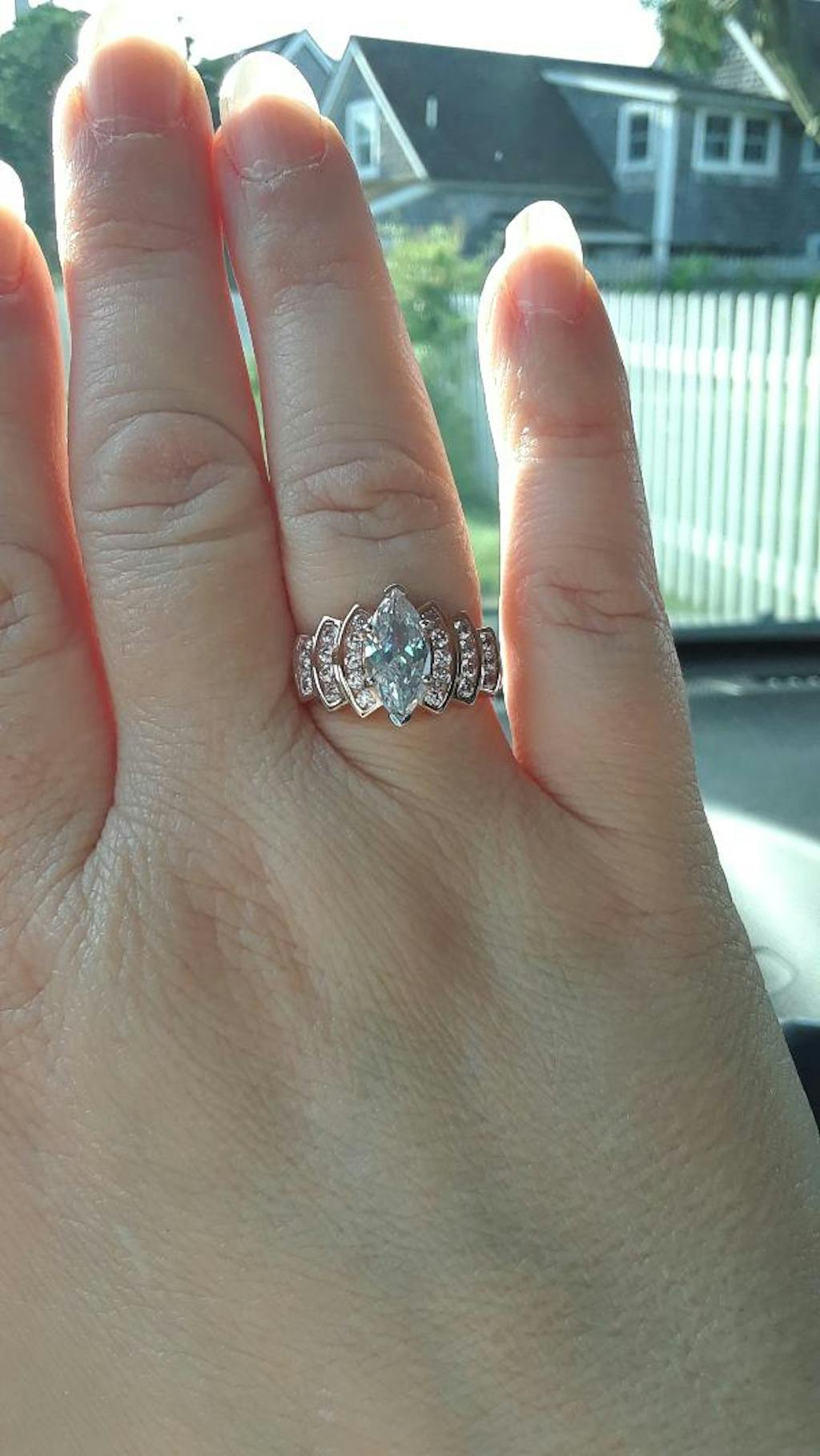 - Stone shape: marquise (center) & round cut